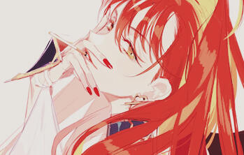 ㅤphysical appearanceㅤ Pale skin, fiery red hair and golden eyes, Aphrodite stands tall at 180 cm. She wears a white toga, plenty of jewelry, and is often found with a cigarette - yet still does not smell, nor taste, like cigarettes.